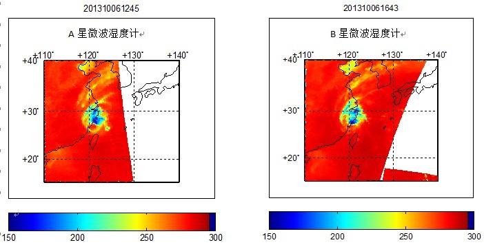 图三:2013年10月6日:FY-3A、B星微波湿度计探测到“菲特”台风登陆我国东南沿海