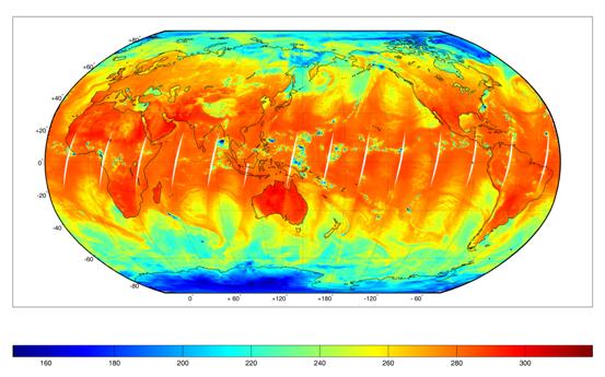 图五:FY-3C行微波湿度计全球亮温图像(150GHz)
