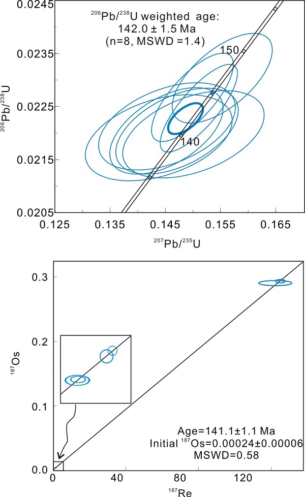 显微矿物学研究表明从石英-黄铁矿脉中挑选出的锆石属于捕获的岩浆锆石,形成于142Ma(图1上),代表着一期岩浆热液事件,随后发生了大规律的硫铁矿化(黄铁矿)。黄铁矿属于低含量高放射性硫化物,其Re的含量一般较低。银家沟黄铁矿的Re-Os同位素研究表明其Re的含量变化较大,并给出了一组较好的等时线年龄,为141Ma(图1下),表明硫铁矿化形成于早白垩世。该期矿化事件的时间要明显晚于斑岩型Cu-Mo矿化(145~148 Ma)。
