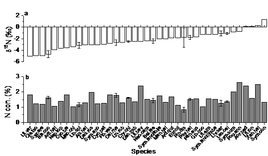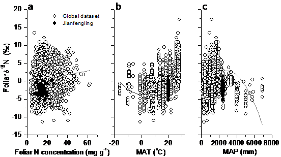 植物叶片同位素15N自然丰度值(δ15N)受氮循环的多个过程及相互作用的影响,能够综合反映生态系统氮循环的特征,如开放程度和可利用N状态。大量研究发现,热带和亚热带相对于温带和北方森林氮更为富足,其生态系统氮周转和循环较快。热带亚热带森林植物叶片和土壤δ15N比温带森林的较高的研究结果也支持这一普通现象。因此,比较不同森林生态系统植物叶δ15N可以判断生态系统氮状态。然而,最近几项发现,我国亚热带森林叶片δ15N多为负值,远远低于全球热带亚热带森林的平均值,而与温带森林的平均值接近。