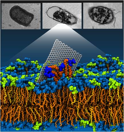 上海应物所物理生物学研究室樊春海、黄庆研究员领导的团队于2010年在实验上首次发现石墨烯的抗菌作用(ACS Nano,2010,4, 4317),即氧化石墨烯可以破坏细菌的细胞膜,从而导致胞内物质外流并杀死细菌。由于这是一种潜在的没有耐药性的物理“抗生素”,该工作发表后立即引起了科技界的广泛兴趣,短短3年已有超过50篇石墨烯抗菌相关研究工作发表。然而,石墨烯如何通过与细菌细胞膜的相互作用而产生强大的抗菌能力,一直缺乏清晰的图景和明确的分子机制。