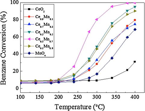 图示:CeO2, MnOx 和CexMn1-x 对苯的催化氧化