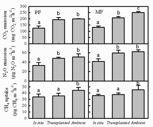图:针叶林(PF)和混交林(MF)的原位、移位和移位所在地土壤CO2、N2O年排放量和CH4年吸收量的比较