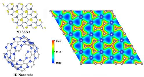 石墨烯是一种由碳原子构成的单原子厚度二维薄膜新材料。由于其导热系数高、电阻率极低、电子迁移速度极快,因此被期待用来发展新一代电子元件或晶体管,用来制造透明触控屏幕、光板等。但是由于其半金属特性(能隙为0 eV),并不适合做热电材料和太阳能电池材料。为此,人们希望通过结构调控和掺杂手段,增大石墨烯的能隙,从而拓展它们在光电器件中的应用。尽管碳基、硅基二维纳米材料是当前的研究热点,但具有适中能隙 (1–2eV),且能隙不依赖于手性或尺寸的材料尚未见报道。