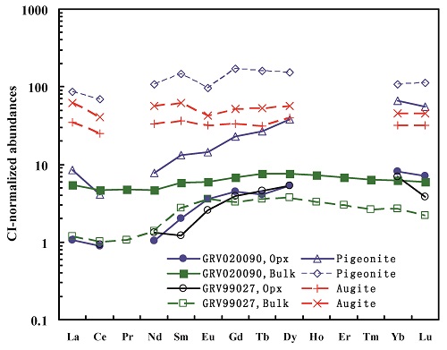 中科院地质与地球物理研究所比较行星学学科组林杨挺研究员等人对GRV 020090火星陨石开展了系统的岩矿分析,在此基础上利用Cameca 1280离子探针分析了不同产状矿物的稀土等微量元素组成,从而对GRV 020090火星陨石的母岩提出两阶段形成模型。他们的研究工作发现,GRV 020090中易变辉石的Al/Ti比值在嵌晶区域较高且均匀,而在粒间区域较低且变化范围大,指示了前者形成于较深的岩浆房,而后者在岩浆上升过程结晶形成。铬铁矿的化学成分与产状有很好的相关性,反映了岩浆中Al2O3和TiO2含量随造岩矿物结晶的变化。应用橄榄石-辉石-铬铁矿,铬铁矿-钛铁矿等温度-氧逸度计,计算了不同结晶阶段的氧逸度变化,结果表明,GRV 020090母岩浆初始结晶的氧逸度与中等亏损型二辉橄榄岩相似,但后期氧逸度有显著的升高。基于最早结晶的橄榄石客晶和易变辉石主晶核部的稀土配分,计算出平衡岩浆具有轻稀土亏损的特征,明显不同于轻稀土富集的全岩和平衡残余岩浆(图2)。据此,他们认为GRV 020090的母岩浆源自火星亏损幔的部分熔融,并在早期结晶堆积形成嵌晶结构部分。随后,该岩浆在上升过程中受到火星壳物质的混染,从而具有富LREE等特征,并结晶形成粒间结构部分。此外,根据辉石的REE原位分析结果可计算出与之平衡的岩浆REE配分。计算表明,初始岩浆(与Opx平衡)具有与中等亏损型二辉橄榄岩质火星陨石(如GRV 99027)母岩浆相似的REE配分模式(图2),但残余岩浆出现LREE富集特征。