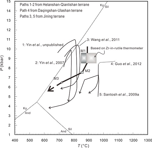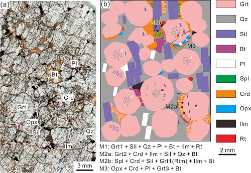 考虑到这些矿物反应可能详细地记录了孔兹岩带在超高温变质作用之后从地壳深熔作用开始的构造热演化历史,中科院地质与地球物理研究所岩石圈演化研究室的博士后焦淑娟及合作导师郭敬辉研究员对该石榴石岩开展了详细的岩石学和地球化学研究。岩相学和矿物化学研究揭示出该石榴石岩三期变质阶段(图1)。其中第一阶段(M1)的矿物组合主要是石榴石变斑晶及其包体和基质矿物,主要有石英、矽线石、斜长石、黑云母、金红石和钛铁矿,形成于部分熔融阶段,随后熔体抽离。石榴石变斑晶中Ca含量呈“钟”状分布,热力学模拟显示这种石榴石生长于减压和/或升温的过程中。第二阶段(M2)发育的矿物组合分布在不同的微域内,以退变质过程取代M1阶段的石榴石或矽线石为特征。在含石英的微域内发育冠状体状石榴石和堇青石(M2a)的组合;在不含石英的微域内发育后成合晶状尖晶石和堇青石(M2b)的组合。最后一个变质阶段(M3)主要是围绕石榴石变斑晶生长的冠状体组合Grt3(石榴石)+ Opx (紫苏辉石)+ Crd(堇青石)+ Pl(斜长石)+ Bt(黑云母)。将观测到的矿物含量和成分与在NCKFMASHTO体系中视剖面图模拟的结果相对比,结合金红石中锆含量温度计的应用,得到了石榴石岩变质演化三个阶段的温压条件,分别为820-850 ºC(可达 950 ºC)和8.5-9.5 kbar(M1)、850-865 ºC和7.4-7.6 kbar(M2)以及 710-720 ºC和6.4-6.6 kbar(M3)。综合起来,得到了石榴石岩从M1到M3阶段一个顺时针的P-T轨迹,显示了一段明确的近等温减压过程,之后转变为降温减压过程,指示了孔兹岩带碰撞后伸展和抬升的过程(图2)。
