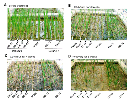 中科院遗传与发育生物研究所张劲松课题组和陈受宜课题组的研究发现,水稻的一个具有S-结构域的受体类激酶OsSIK2参与调控非生物胁迫反应和衰老过程。OsSIK2定位于细胞质膜,在Mn2+存在下具有激酶活性。OsSIK2基因主要在水稻叶片和叶鞘表达,其表达受盐、干旱、冷害和植物激素ABA的诱导。过表达OsSIK2的水稻株系同对照株系相比呈现对盐胁迫和干旱胁迫的耐性。而突变体在这些胁迫处理后出现更加敏感的症状。当把OsSIK2的胞外域删除之后,表达截短蛋白的株系呈现比表达全长蛋白的株系更高的耐盐性(图1)。