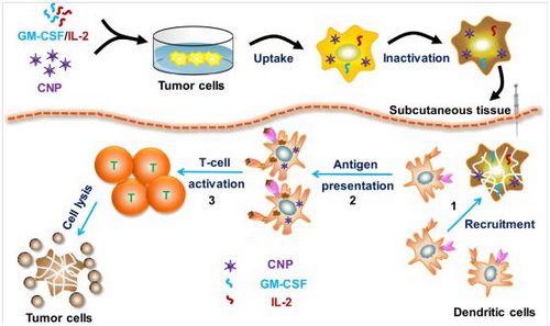 肿瘤疫苗通过激发患者自身的免疫系统,从而诱导机体产生特异性的免疫应答,具有特异性强、副作用低的优点,是一种极具潜力的肿瘤生物治疗方法。由于目前多数肿瘤抗原未得到鉴定,因此包含肿瘤全部抗原的肿瘤全细胞疫苗有望激发机体产生多价的免疫应答,具有最为广泛的应用前景。由于树突状细胞(DC)不能有效迁移、抗原提呈能力不足和T细胞增殖能力较弱,造成了传统的肿瘤全细胞疫苗免疫原性弱的特点,所激发的免疫反应有限。