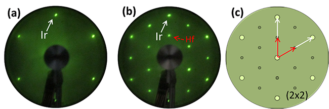 图1. Ir(111)表面铪烯形成前后的LEED图像:(a)干净基底,白色箭头标示的六个衍射点来源于Ir(111)表面的六重对称性;(b)样品沉积铪并经过退火处理,虚线箭头标示出了新产生的衍射点,表明铪层在Ir(111)表面形成了相对于基底格子的(2x2)超结构。(c)Ir(111)表面(2×2)超结构的理想LEED图像,实验图像b图与其完全一致,每组衍射点由白色和淡绿色圆斑分别标示。