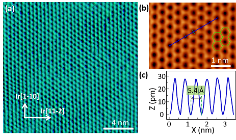 图2. (a)Ir(111)表面生长的铪烯晶格的高分辨STM图像(U = -1.0 V, I = 0.8 nA),基底Ir[1-1 0]和Ir[11 -2]方向由白色箭头标示。(b)铪层的原子分辨STM图像(U = -0.7 V, I = 0.16 nA),铪层的蜂窝状原子晶格由绿色六角形标示。(c)是(b)图中沿蓝色直线所示的剖面线,显示铪层六角晶格的周期为5.4 Å(为基底Ir (111)表面晶格常数的2倍,和图1中LEED测量结果完全一致)。