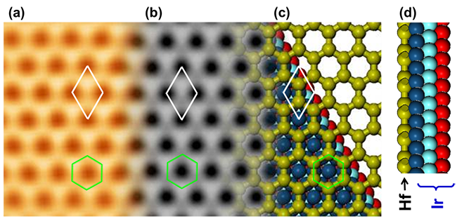 图3.(a)原子分辨的STM图像(-1.5 V, 0.1 nA),蜂窝状结构用六角形表示。(b)理论模拟的STM图像(-1.5 V),显示的特征和实验结果一致。(c)第一性原理理论计算获得的Ir(111)基底上铪层的蜂窝状结构的原子弛豫模型,铱(2×2)超格子刚好对应于铪层蜂窝结构的(1×1)格子, 如平行四边形所示。(d)为c图弛豫原子模型的侧视图,显示了Ir(111)表面上的平面Hf层结构。