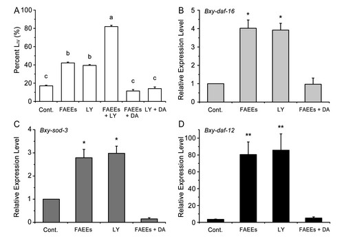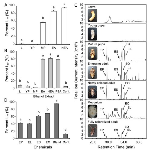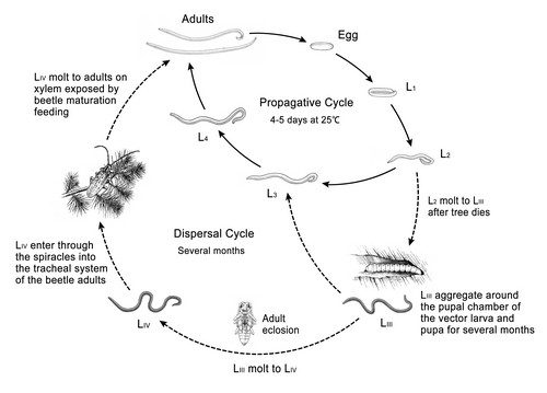 松材线虫(Bursaphelenchusxylophilus)是一种世界性检疫病害,也是我国松树的毁灭性外来入侵种,已造成我国南方17个省市的松林大面积死亡。中科院动物研究所孙江华研究组赵莉蔺副研究员等最新研究表明,松材线虫转型发育与其媒介昆虫—松墨天牛羽化过程高度偶联是松材线虫扩散的关键。松材线虫具有两个扩散周期虫态:扩散型三龄线虫(LⅢ)形成扩散型四龄线虫(LIV)。松墨天牛在羽化过程中释放大量C15-C18脂肪酸乙酯,启动松材线虫Insulin和DA/DAF-12信号通路,改变发育途径,进而诱导扩散型三龄线虫(LⅢ)形成扩散型四龄线虫(LIV)。只有扩散型四龄线虫(LIV)能够被媒介天牛携带并转移到新的健康松树开始新一轮的侵染循环。据此推测松材线虫在进化过程中形成了一种特殊的生存策略,失去了自身转型发育的信息素调控功能,转而依靠媒介天牛羽化信息识别转型时机,完成自身转型发育进行传播扩散(Current Biology. 23: 2038-2043)。