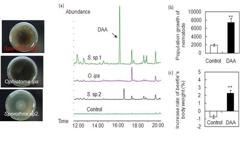 而“松材线虫-媒介天牛-蓝变菌”共生互作是促进松材线虫危害的关键生物因素。其中,共生蓝变菌介导了松材线虫-松墨天牛共生体的危害流行和生长发育。通过8年野外调查和室内试验相结合,发现我国浙江、安徽、江苏、广东等危害严重的发生区普遍存在一种特有的伴生蓝变菌Sporothrixsp.1。松材线虫和松墨天牛的种群密度和Sporothrixsp.1发生频率显著相关。进一步的室内生测表明,Sporothrixsp.1能够提高松材线虫后代雌雄性比、大小等适合度,并改善其年龄结构,同时,Sporothrixsp.1能够促进松墨天牛幼虫的生长发育,并提高其存活率。进一步试验分析表明Sporothrixsp.1诱导寄主松树产生大量双丙酮醇,而双丙酮醇能够显著促进松材线虫繁殖和松墨天牛的生长发育(Ecology. 2013.)。