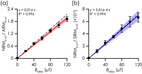 图3 相对古强度估计(a)非磁滞剩磁归一化结果;(b)饱和等温剩磁归一化结果;阴影区为95%置信区间