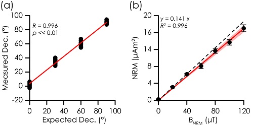 图2 磁偏角(Dec)和天然剩磁(NRM)强度随外磁场变化(红色线条和黑色短线分别表示为实验数据拟合线和期望值)