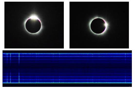 上图:日全食开始前后产生的贝利珠。下图:日食期间FASOT原理样机采集的积分视场单元内25个空间点产生具有相反偏振态的50条闪耀偏振光谱(50根光纤,从上到下)。从左到右第1、3和4条发射线为中性镁三重线的闪耀光谱。