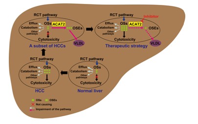 博士后鲁明和博士研究生胡西旵等研究人员通过对肝癌病人的组织样本以及肝癌细胞株的研究发现,在一部分肝癌里存在一条特异性的胆固醇代谢途径,其包括ACAT2基因的诱导高表达与ACAT2介导的过量氧化型胆固醇的酯化分泌过程。肝癌细胞通过这条代谢途径消除过量氧化型胆固醇的细胞毒性。进一步的研究显示,在肝癌细胞株或肝癌移植瘤中,利用ACAT2特异性抑制剂阻断该特异性胆固醇代谢途径,可导致游离氧化型胆固醇的累积而抑制肝癌细胞株或肝癌移植瘤的生长。深入的机制研究表明,ACAT2基因启动子区域的低甲基化,在肝癌细胞诱导高表达ACAT2中发挥至关重要的作用。该研究发现一条肝癌自身生长特异的胆固醇代谢途径,对肝癌特别是晚期肝癌的临床治疗具有重要的意义。