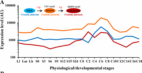 基于转录组数据(Gene Network)及磷酸化蛋白质组数据(Kinase Recognition Motif)预测的嗜热四膜虫蛋白质磷酸化信号通路范例