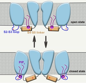 PIP2分子与打开和闭合结构的不同结合模式