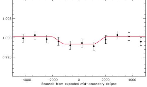 图1:Ks波段的光变曲线,黑色数据点是实测相对流量及其误差,红色曲线是与观测吻合的最好的理论光变曲线。掩食深度约0.196±0.029%。