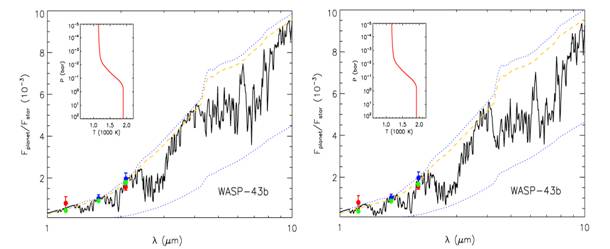 图2:行星与恒星亮度的比值图,其中蓝色点是该项工作的测量值,红色点是来自Gillon 等(2012)年的工作,绿色点是理论光谱换算成对应的测光数据的值。黑色曲线是理论光谱,其中左边图是假设太阳丰度比,右边假设金属丰度相对于太阳超丰5倍。小插图是行星大气的温度-压强轮廓。