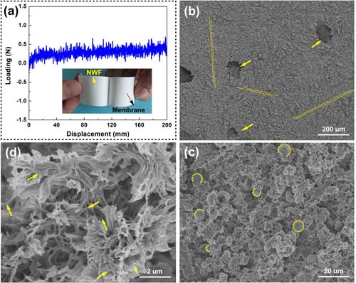 图1 (a) PVDF膜与无纺布的剥离载荷实验,内插图为剥离成膜照片。(b-d) 膜表面电镜照片(尺度分别为200微米,20微米,2微米)