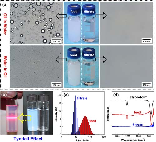 图2 油水乳液分离实验效果 (a) 水包甲苯乳液 (上图) 和甲苯包水乳液 (下图). (b-d) 水包氯仿微乳液(b)Tyndall 效应(c)动态光散射检测液滴尺寸分布(d)过滤前后溶液红外谱图