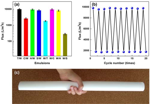 图3 (a) 水包油及油包水乳液的渗透通量. (b) 水包甲苯及甲苯包水乳液的交替循环通量 (c) 大面积高强度超亲/超疏转换特性聚偏氟乙烯微孔膜