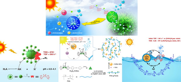 为了探索利用太阳能高效催化制氢的新途径,中国科学院理化技术研究所超分子光化学课题组深入开展了多个模拟氢化酶功能体系构建和催化机理的研究。在温和的条件下,高效、高产率地合成了一系列结构多样的新型氢化酶模拟化合物;构筑了第一个人工模拟铁氢化酶光致产氢的分子催化剂;利用自组装将光敏剂与铁氢化酶模拟化合物引入水相,模拟还原了自然界氢化酶的产氢环境;在国际上率先突破了铁氢化酶模拟化合物稳定性差、催化效率低的瓶颈,实现了太阳光驱动铁氢化酶模拟化合物的水相高效产氢,构筑了高效、稳定、廉价的模拟酶光催化产氢新体系,获得了目前铁氢化酶模拟化合物光催化体系的最高产氢效率,从分子水平上揭示了模拟铁氢化酶体系的光催化产氢机理。例如:通过界面组装的方法将铁氢化酶模拟化合物组装到水溶性CdSe量子点的表面,成功制备的水溶性模拟铁氢化酶光催化剂在光照80小时产生氢气的催化转化数(TON)和催化速率(TOF)高达8781和596h-1;通过共价键的方式将铁氢化酶模拟化合物挂接在水溶性高分子(PAA)骨架上,以CdSe量子点和PAA聚合物催化剂构筑的光催化体系光照8小时TON达到27135,初始产氢速率TOF达3.6s-1,是目前铁氢化酶模拟化合物光催化产氢的最高效率;通过分子自组装将铁氢化酶模拟化合物和CdTe量子点包裹在壳聚糖中,模拟铁氢化酶催化活性中心所处的蛋白环境对催化产氢行为的影响,研究发现壳聚糖光催化产氢体系的稳定性显著提高,与相同条件没有壳聚糖存在的体系相比,催化产氢活性提高了4000多倍,TON高达52800。