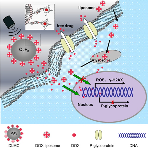 利用这一特性,医学超声课题组邓志婷、严飞、靳巧锋等设计制备了超声响应性的脂质体-微泡复合物携载化疗药物阿霉素(DOX),研究其在联合超声的作用下逆转肿瘤细胞的耐药性,并探讨了可能的作用机制。研究表明:载药微泡复合物联合超声可以增强阿霉素的细胞摄取,并且促进药物快速进入细胞核、减少药物的外排,从而增强了阿霉素对耐药型乳腺癌细胞的杀伤活性。进一步的机制研究发现,载药微泡复合物联合超声可以显著提高耐药细胞的氧自由基水平并降低P-糖蛋白的表达,从而增强耐药细胞的DNA损伤水平及细胞凋亡。该研究对于发展新型超声给药及治疗技术具有重要的学术与技术价值。