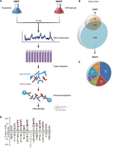 上海药物所化学蛋白质组学中心和芝加哥大学通过进一步合作,系统研究了大肠杆菌中的琥珀酰化修饰底物,并发现了该修饰的调节酶CobB。此次研究在大肠杆菌中发现了670个蛋白上的2580个赖氨酸琥珀酰修饰位点,是原核生物中赖氨酸琥珀酰修饰研究的第一批数据资料。同时还在782个蛋白中找到了2803个乙酰化修饰位点,获得了野生型大肠杆菌中最大的赖氨酸乙酰化修饰数据库。