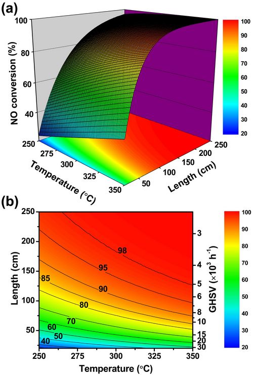 本研究对涂覆型蜂窝催化剂的SCR反应动力学进行了计算,试验结果与计算表明:在较低NH3/NO条件下,SCR反应是对于NH3的一级反应,而在NH3/NO高于0.8时为零级反应。由于实际脱硝中所采用的NH3/NO基本在0.8以上,因此涂覆催化剂上SCR反应的动力学方程可以简写为rNO=kCNO。进一步测试了不同长度催化剂在不同温度下的脱硝性能,结果表明,用一级反应方程描述涂覆催化剂上的SCR反应是合理的。根据一级反应方程,可求得不同温度下的反应速率常数k,并根据阿累尼乌斯公式对lnk和1/T做图,可以得出涂覆催化剂上SCR反应的表观活化能约为27kJ/mol,指前因子为3718s-1。根据所求的动力学参数,我们可以预测在任意温度和催化剂长度下NO的转化率(如图所示)。从图中可得到在不同条件下,要达到特定的NO转化率所需要催化剂的长度与空速,此结果可作为中试反应器设计的理论依据。