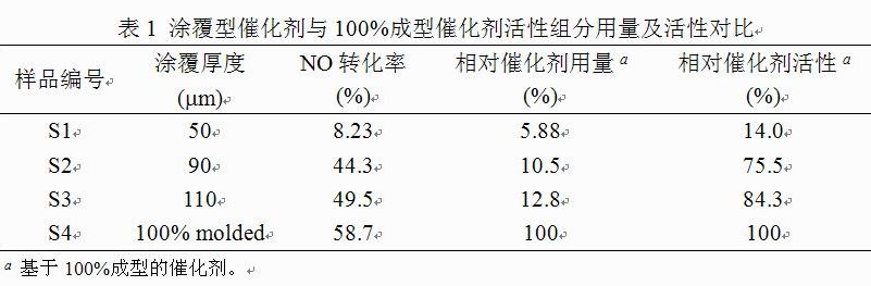 中科院过程工程研究所先进能源研究室与日本明电舍(株)合作研发了高效低成本的涂覆型蜂窝脱硝催化剂,将粉末催化剂涂覆在廉价蜂窝载体上用于燃煤烟气脱硝,可大大减少脱硝催化剂活性组分的用量,从而有效降低催化剂成本。研究中考察了涂覆厚度对蜂窝催化剂活性的影响,当涂覆厚度达到110μm时催化剂活性与100%成型催化剂相差不大。如表1结果所示,涂覆厚度为100μm的催化剂其活性为100%成型催化剂的84.3%,但其催化剂用量仅为100%成型催化剂的12.8%,大大节省了粉末催化剂的用量。实验表明涂覆催化剂对模拟烟气和实际燃煤烟气具有相同的催化活性。