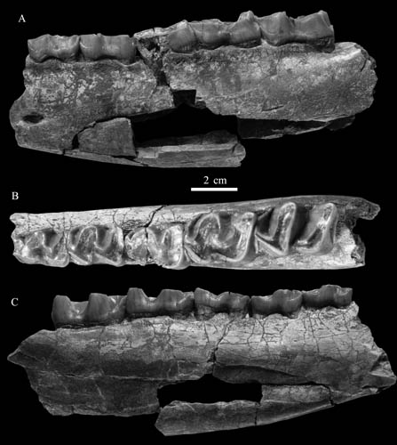 杨氏广南犀(新属新种)左下颌骨,A 颊侧视,B 冠面视,C 舌侧视。(王海冰供图)