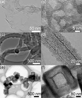 图1:镁热还原制备的碳纳米材料 (a-b) 石墨烯透射电镜照片;(c-d) 管状碳纳米结构透射电镜照片;(e-f) 中空碳纳米盒子透射电镜照片