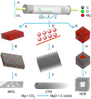 图2:碳纳米材料的形成机理 (A-C) 石墨烯的形成图示;(D-E) 管状碳纳米结构的形成图示;(G-I) 中空碳纳米盒子的形成图示