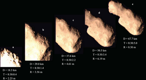 图1 2012年12月13日,嫦娥二号在飞越后对图塔蒂斯小行星成像结果。图a-e给出探测器在远离小行星过程中的成像序列。图a-d中小行星左侧部分被探测器的太阳帆遮挡。每张图片的成像距离(D)、成像时间(T,UTC)和分辨率(R)在图像下方给出,其中成像距离的误差为1.1公里,图像的分辨率与成像距离为线性关系。