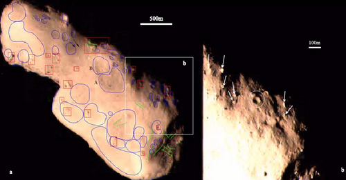图2 图塔蒂斯表面的各种地貌特征。 (a)在图塔蒂斯的完整图像中标注了坑(蓝色轮廓)和巨石(红色方框)。其中有两个坑的位置非常靠近:较小的坑(B)似乎叠加在较大的坑(A)之上。绿色曲线表征了小行星的线状结构。黑色箭头标出了表面细壤的流向。(b)对图(a)中方框中部分图像的放大。图中给出一个形态完整的坑,其周围随机分布了十余个碎石。