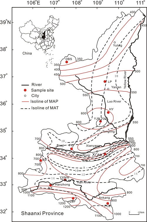 中科院地质与地球物理研究所特提斯研究中心博士研究生刘志锋和导师刘青松研究员,系统研究了沿着陕西降水梯度带上(300~1300mm)分布的一系列土壤剖面(图1)的磁学性质,使用频率磁化率(cFD)和等温剩磁的硬磁组分(HIRM)分别指示土壤中亚铁磁性矿物(磁铁矿)和反铁磁性矿物(赤铁矿)含量,结果表明:(1)土壤剖面cFD和HIRM线性相关,且拟合斜率(cFD/HIRM )与年平均降水量MAP密切相关,受母质、地形和温度变化影响较小;当MAP小于1000mm时,使用cFD/HIRM建立的古降水转换函数:χFD/HIRM= 0.1244×MAP–31.6(R2=0.92,预测误差70mm)(图2),该转换函数对东亚中纬度地区的古降水重建具有重要意义;(2)降水小于1000mm时,土壤中同时生成成土磁铁矿和赤铁矿,但前者生成的速率比后者快,而降雨量大于1000mm时,溶解作用发生,赤铁矿比磁铁矿难溶解,故χFD/HIRM随降水量先升高后降低,转折点为1000mm左右;(3)χFD/HIRM值为0时,MAP为250mm,指示当年均降水低于这个值基本没有成土矿物生成,因而该古降水转换函数的理想工作区间为250-1000mm。