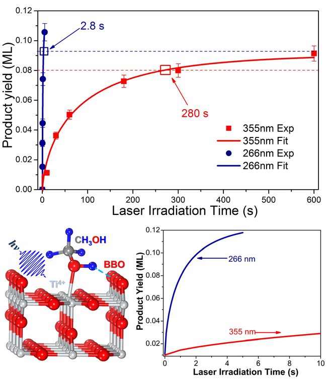 在本次研究中,在波长266nm光照条件下,甲醇分子光致解离的量子产率比波长355nm光照产率高两个量级左右,而TiO2对266nm的吸收效率仅为355nm的两倍。这个实验结果表明,光子能量(电子和空穴的能量)对光催化效率有着重要的影响。一种可能的机理解释是光激发产生的电子和空穴直接与甲醇分子作用,诱发了化学反应,而不是弛豫后再与甲醇分子作用诱发反应。另外一种可能的解释是,光致激发产生的电子和空穴复合后生成高激发模式的声子,其与甲醇分子耦合后激发分子的某些振动模式,促使甲醇解离。如果能真正理解二氧化钛表面光催化反应发生的本质机理,将会为设计与发展高效催化剂和完善光催化模型提供更好的支持。