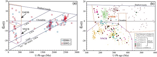 中科院地质与地球物理研究所岩石圈演化研究室博士生徐建强在导师李忠研究员的指导下,重点采用砂岩碎屑和重矿物高分辨率物源分析方法研究了鲁西隆起北部侏罗系碎屑物源,并综合探讨了华北东部侏罗纪构造古地理演化。研究结果显示,侏罗系砂岩样品的前寒武纪碎屑锆石U-Pb年龄及其Hf同位素组成与广泛出露于北部的华北克拉通基底一致(图1)。根据缺乏新元古代中期(700~850Ma)岩浆年龄和三叠纪变质年龄的事实,他们排除了扬子板块及现今临近于鲁西隆起东南部的苏鲁造山带物质来源。显生宙年龄(256~393Ma)记录的晚古生代岩浆活动均未发现于鲁西隆起及其邻近地区,而依据其εHf(t)值特征可分为-21.9~-3.0和-1.0~+12.7两部分(图1),可分别与华北北缘和兴-蒙造山带对比。综合砂岩碎屑模式以及沉积体系分析指示,从早-中侏罗世到晚侏罗世来自华北北缘和兴-蒙造山带的碎屑物源具有增长趋势。