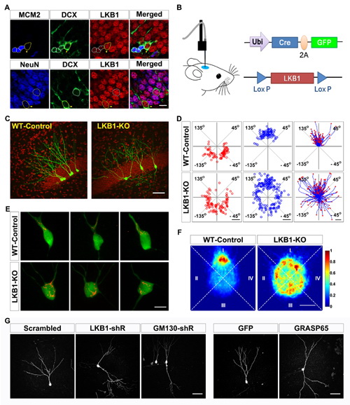图A显示LKB1的蛋白水平在成年海马新生颗粒细胞中显著升高;图B为运用在体定点注射逆转录病毒策略在成年新生颗粒细胞中特异性敲除LKB1基因的模式图;图C和D显示敲除LKB1破坏成年新生颗粒细胞中树突的数目唯一性和方向选择性;图E和F显示敲除LKB1 破坏细胞内高尔基体的极性分布;图G显示改变高尔基体结构相关蛋白的表达以破坏高尔基体极性分布,能够模拟LKB1 基因敲减所造成的树突发育异常的表型。