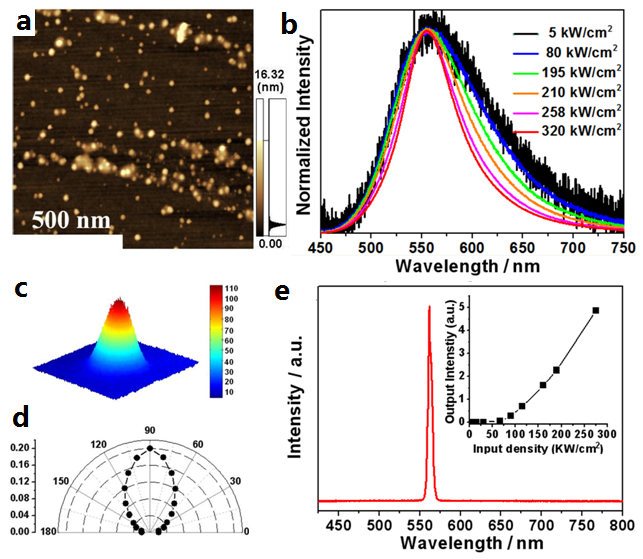 图1.(a)碳纳米粒子原子力扫描图;(b)碳纳米粒子乙醇溶液不同泵浦强度下的发射光谱;(c)碳纳米粒子激光远场光斑;(d)碳纳米点激光强度随偏振方向变化的曲线;(e)碳纳米点激光发射光谱和阈值曲线。