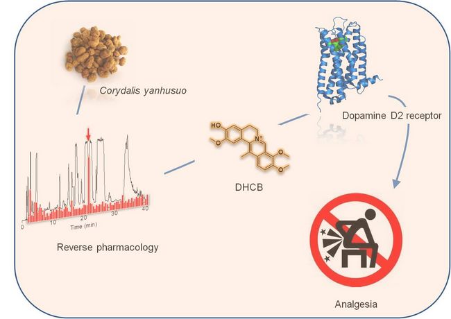 在此次合作研究中,两国科学家聚焦于镇痛活性成分的发现。研究者首先采用高效液相色谱分离技术将十种知名镇痛中药制备成500个标准组分,通过系统活性筛选,最终将目标锁定在了延胡索的一个组分上。经过进一步的纯化分离和结构鉴定,确认其中的活性化合物为DHCB。并以小檗碱为原料,实现了DHCB的化学半合成。动物实验表明,DHCB对急性疼痛、炎症性疼痛和神经性疼痛都有显著的缓解作用,虽然在镇痛效果不如吗啡,但在作用持续时间以及耐药性上,DHCB都要明显优于吗啡。此外,研究者还发现,DHCB的作用靶点并非阿片受体,而是与多巴胺D2受体相关,这将大大降低该化合物的成瘾风险。因此DHCB对于低水平、持续性的慢性疼痛可能具有较好的治疗前景。而慢性疼痛,特别是神经性慢性疼痛,临床尚缺乏有效治疗手段,从而往往导致患者滥用止痛药。DHCB的发现,为此类疼痛问题的治疗带来新的希望。