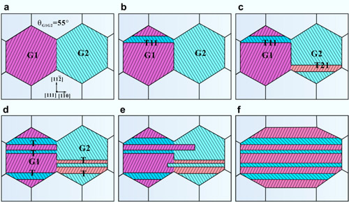 最近,中国科学院金属研究所沈阳材料科学国家(联合)实验室材料疲劳与断裂研究部研究员张广平领导的课题组(包括博士生罗雪梅和副研究员朱晓飞)通过对纳米尺度面心立方结构的金薄膜疲劳加载下晶粒长大原子尺度的观察与理论分析,揭示了孪生辅助纳米晶粒长大的物理机制。这项研究发现,室温下的疲劳加载导致平均晶粒为19 nm的20 nm厚金薄膜中晶粒长大;同时,发生孪生的晶粒数目明显增加。大多数长大的晶粒中出现了纳米尺度的多重孪晶。通过原子尺度的观察和分析发现:纳米孪晶的形成是辅助晶粒长大的一个有效方式。这一物理过程为:疲劳加载下孪晶的形成可以逐渐改变晶粒的局部取向,并促使晶界分解为易迁移的片段(图1);随着循环周次的增加,两个晶粒通过相互的孪晶形成以及晶界的不断分解,逐渐合并长大为一个晶粒。为此,科研人员提出了一个循环加载下“孪晶辅助纳米尺度金薄膜晶粒长大”的全新物理机制(图2)。