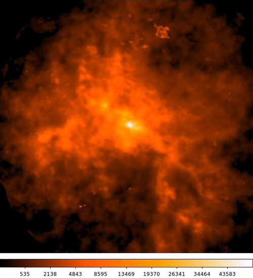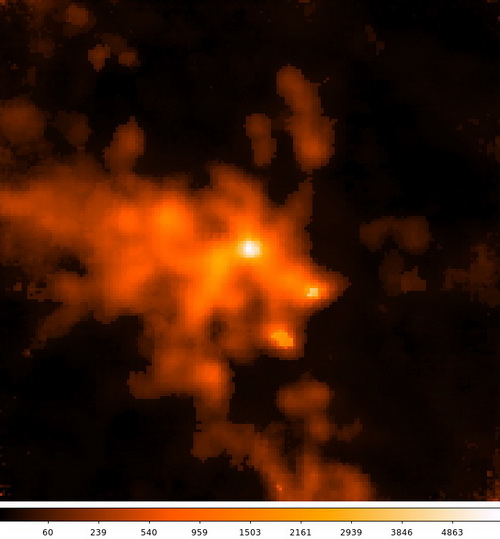图2 W49A中心区域约3光年左右的分子云柱密度分布图。图中最明亮的区域大小不到3个光年,却包含了105太阳质量的分子气体。