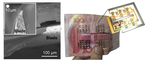 左: 表面覆盖320纳米有机场效应晶体管刀刃的扫描电镜照片,插图为侧视图。右:自支撑的五阶环形振荡器和转移到百元人民币衬底上照片。