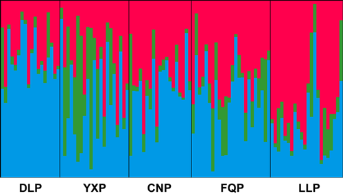 为研究大理茶的遗传多样性、栽培起源和驯化问题,中国科学院昆明植物研究所赵东伟、杨俊波、杨世雄同日本冈山大学、合肥工业大学研究人员合作,利用核基因组14个微卫星位点,对采自云南西部、南部和临近境外地区大理茶的16个野生、5个栽培和4个近期驯化居群共587份样品进行了分析。研究结果显示,大理茶总体的遗传多样性处于较高的水平,野生大理茶的基因多样性和等位基因丰富度要显著低于栽培或近期驯化的居群,表明人为破坏显著地降低了大理茶野生种群的遗传多样性水平。在此情况下,只能通过比较栽培和近期驯化居群间的遗传多样性差异来寻找可能的、驯化导致的遗传瓶颈效应。分析表明,栽培大理茶的遗传多样性水平略有降低,但差异并不显著,说明对大理茶的驯化并未出现显著的遗传瓶颈效应,这可能与其较长的生活史周期、居群间较高的基因流水平等因素有关。