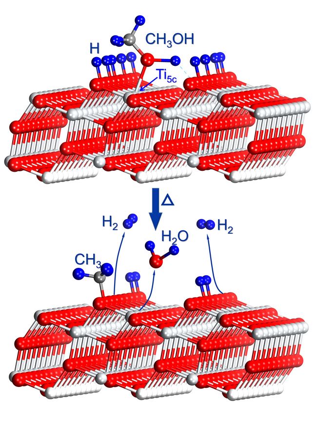 甲醇能够提高二氧化钛光催化分解水的产氢效率,同时甲醇本身也能光催化产氢。目前普遍认为anatase表面的光催化产氢效率要高于rutile表面,但是产氢反应的机理仍不是十分清晰。如果能从分子水平上理解二氧化钛不同表面的产氢机理,能为发展高效催化剂提供新的思路。