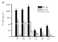 该团队在前期发现土壤微生物具有可观的碳同化能力的基础上,运用同位素连续标记技术结合分子生物学技术,对土壤自养微生物光合同化碳的层次分布与传输进行了进一步的深入探讨,发现土壤不同层次间的14C-SOC量随着土壤深度的增加而显著减少。第三层5-17cm的底层土壤,有近1/4的土壤未检测到14C的存在,这可能与仅土壤表层很薄的一层能接受光能的原因有关。这说明土壤微生物的同化作用只发生在表层土壤,但是表层同化碳可以向下传输,传输能力因土壤而异,而且向下传输的同化碳,可能也为底层的化能自养微生物提供碳源和电子供体,从而在一定程度上可能诱导化能自养微生物参与碳同化过程。而且,不同层次间的土壤碳同化关键酶RubisCO酶活性、关键功能基因cbbL数量均随着土壤深度的增加而显著减少,并且稻田土壤的RubisCO酶活性、cbbL功能基因数量亦显著大于旱地土壤。该研究深化了我们对土壤微生物光合同化碳的生物地球化学过程机理的认识。